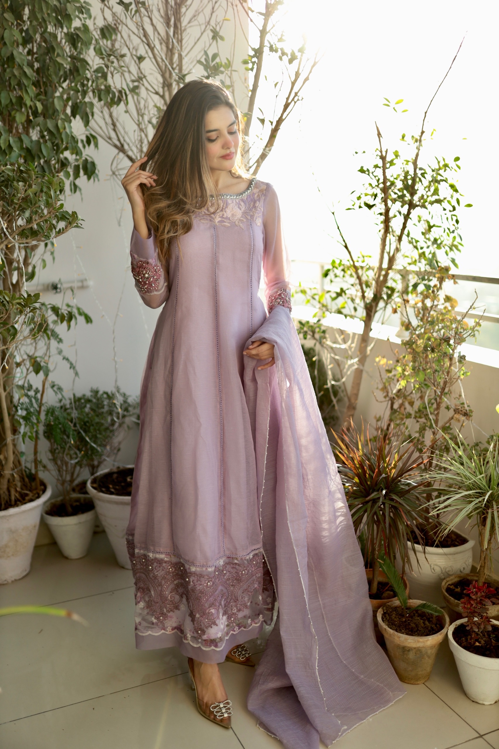 The figure flattering silhouette has embroidered lace on the daaman, adding that extra bit of glamour to your outfit.